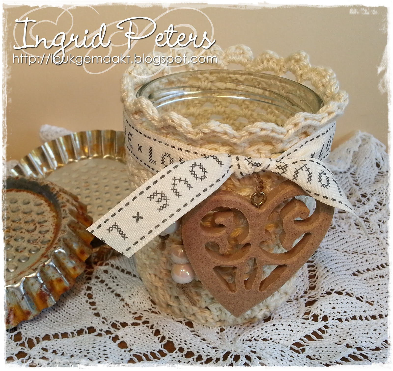 Verder heb ik een jampot windlichtje voor haar gemaakt. Op Pinterest zag ik vergelijkbare potjes voorbij komen als ik altijd maakte, maar dan met een geschulpt randje erbovenaan. Dit vond ik zo leuk staan, dat ik het meteen heb uitgeprobeerd. Op het blog van Erica zag ik dat Thea een leuk patroon op haar blog heeft gezet van vergelijkbare windlichtjes. Het is zo leuk om te maken en het geeft mij een goed gevoel om de potjes te recyclen ;-)
